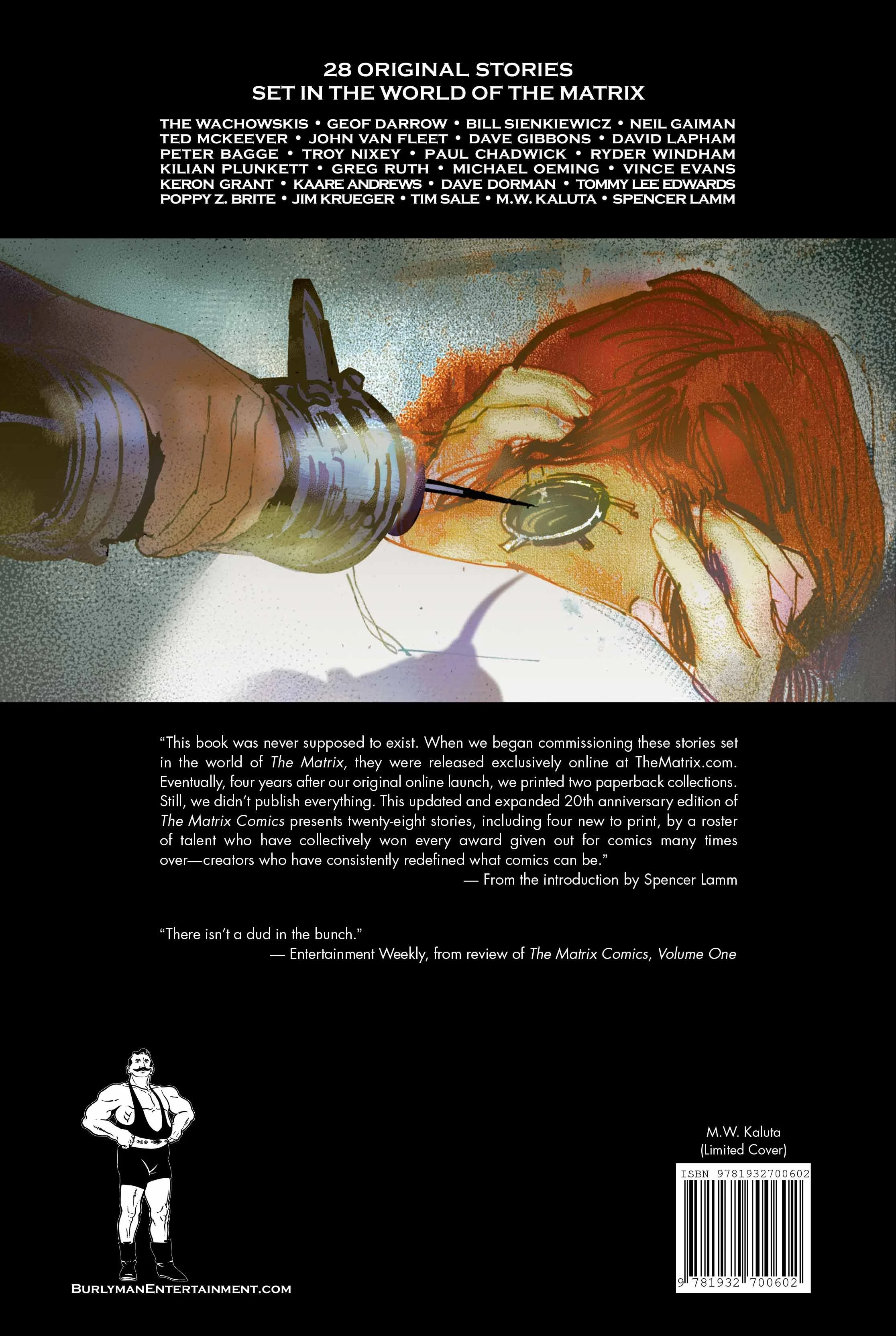 Burlyman THE MATRIX COMICS: 20TH ANNIVERSARY EDITION (HARDCOVER, Pod Cover, wide release) $49.99 THE MATRIX COMICS: 20TH ANNIVERSARY EDITION (HARDCOVER— Sienkiewicz Cover) $59.99 THE MATRIX COMICS: 20TH ANNIVERSARY EDITION (HARDCOVER— Kaluta Cover) $59.99 THE MATRIX COMICS: 20TH ANNIVERSARY EDITION (HARDCOVER— Trinity Cover) $59.99 V FOR VENDETTA: FROM SCRIPT TO SCREEN (Paperback) $49.99 Doc Frankenstein: The Post Modern Prometheus (THE COMPLETE—AND OVERSIZED—HARDCOVER) $34.99 The Matrix Comics: Volume One (Paperback) $19.99 TWO BOOK DEAL: THE MATRIX DELUXE 20th ANNIVERSARY HARDCOVER HC (SIENKIEWICZ COVER) AND DOC FRANKENSTEIN HC $85.00 TWO BOOK DEAL: THE MATRIX DELUXE 20th ANNIVERSARY HARDCOVER HC (KALUTA COVER) AND DOC FRANKENSTEIN HC $85.00